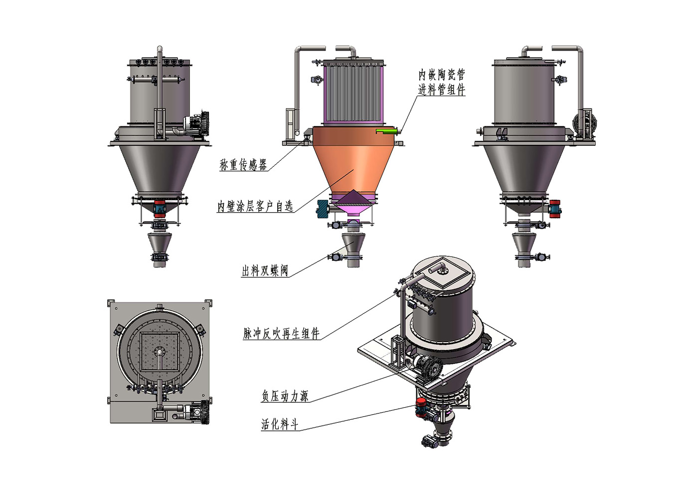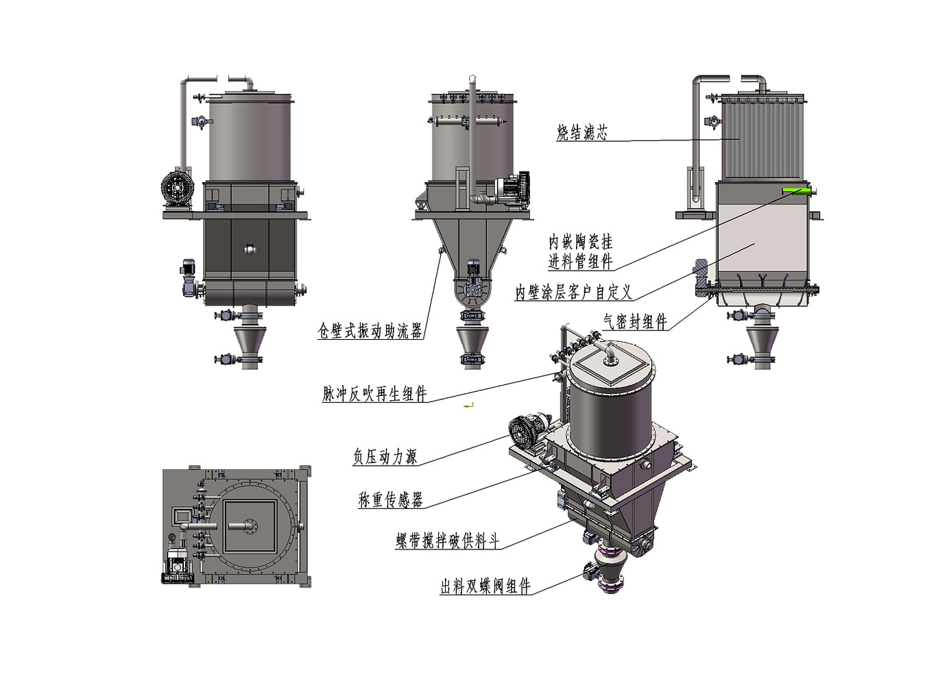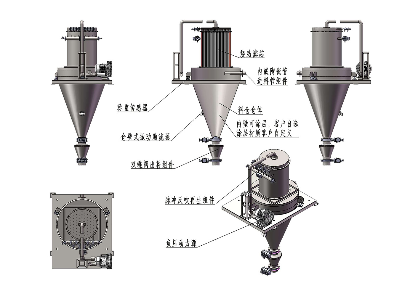 如上图所示: 根据客户要求,可定义仓体容积,可定义上料效率,可定义出料效率,可定义物料存储重量,物料重量实时可视; 要求:上级给料需要匀速给料,常规配置星型给料机匀速给料; 材质:所有部件材质客户均可自定义,未定义出厂标准为:仓体sus304,机架Q235材质,滤芯为PE烧结滤芯(客户可自选金属钛烧结滤芯或PA烧结滤芯);